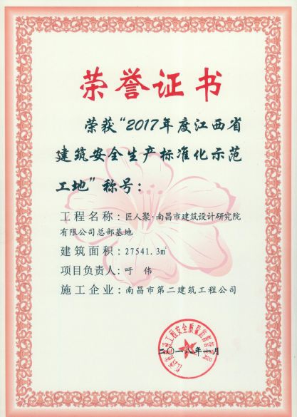 公司承建的郭家莊地塊棚戶區(qū)改造項目(安置房)工程、匠人聚.南昌市建筑設(shè)計研究院有限公司總部基地榮獲2017年度江西省建筑安全生產(chǎn)標(biāo)準(zhǔn)化示范工地稱號。