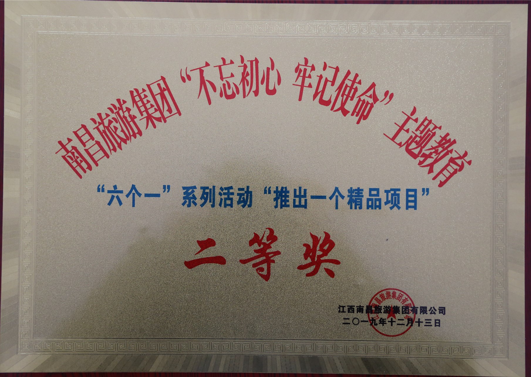 【概要描述】 12月13日下午,南昌旅游集團(tuán)在滕王閣會見廳召開“不忘初心、牢記使命”主題教育“六個一”活動暨董事長獎勵表彰大會,我公司參評的“...