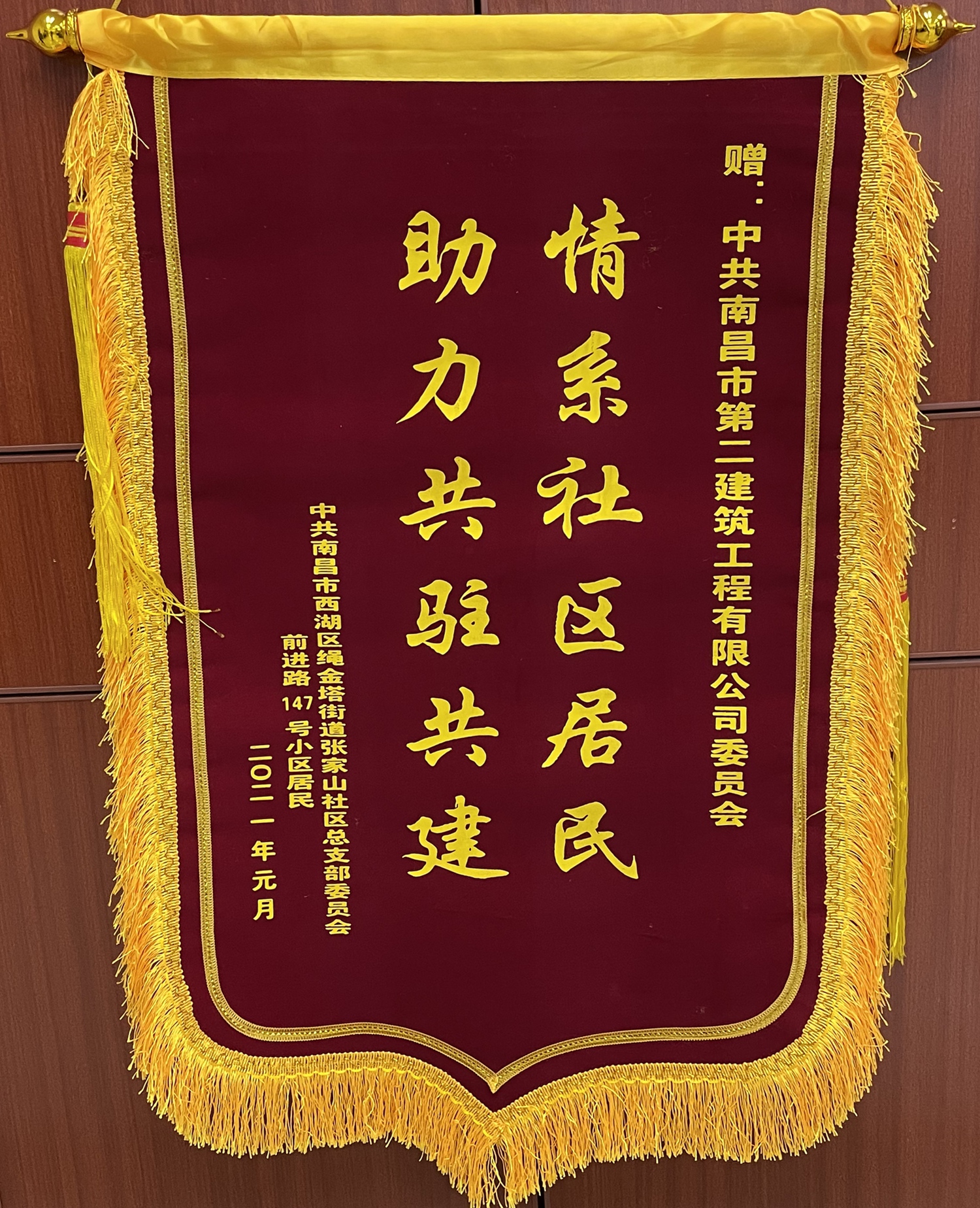 3月9日下午,南昌市西湖區(qū)張家山社區(qū)干部群眾一行來(lái)到南昌市第二建筑工程有限公司,代表社區(qū)黨總支部和20多戶(hù)社區(qū)居民向公司黨委書(shū)記、董事長(zhǎng)王彥送上“情系社區(qū)居民,助力共駐共建”錦旗,并再三表示感謝,言語(yǔ)之間,情意切切。